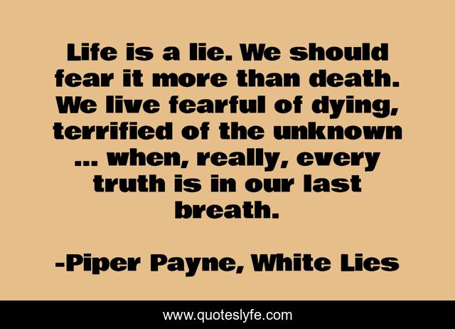 This page presents the quote "Life is a lie. We should fear it more than death. We live fearful of dying, terrified of the unknown … when, really, every truth is in our last breath.". Author of this quote is Piper Payne, White Lies. This quote is about living, life, death, pain, dying, funeral, sadness, hurt, suffering,.
