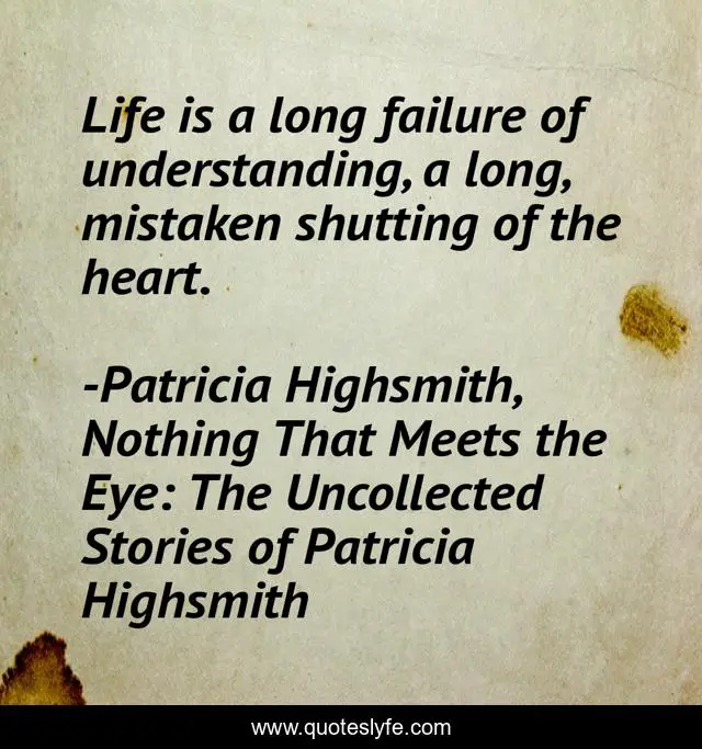 This page presents the quote "Life is a long failure of understanding, a long, mistaken shutting of the heart.". Author of this quote is Patricia Highsmith, Nothing That Meets the Eye: The Uncollected Stories of Patricia Highsmith. This quote is about heart, life, mistaken, understanding, failure, shutting,.