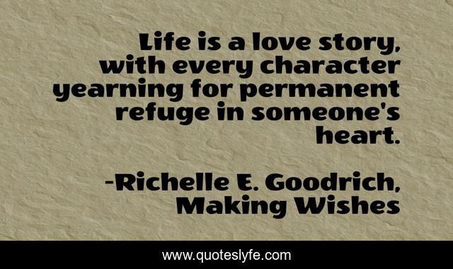 This page presents the quote "Life is a love story, with every character yearning for permanent refuge in someone's heart.". Author of this quote is Richelle E. Goodrich, Making Wishes. This quote is about heart, love, romance, richelle, refuge, love-story, richelle-goodrich, affection,.