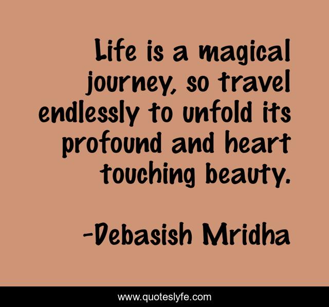 This page presents the quote "Life is a magical journey, so travel endlessly to unfold its profound and heart touching beauty.". Author of this quote is Debasish Mridha. This quote is about life, debasish, life-is-magical, mridha, travel, philosophy, debasish-mridha, heart-touching-beauty, magical-journey,.