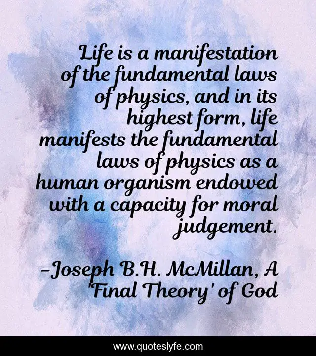 This page presents the quote "Life is a manifestation of the fundamental laws of physics, and in its highest form, life manifests the fundamental laws of physics as a human organism endowed with a capacity for moral judgement.". Author of this quote is Joseph B.H. McMillan, A 'Final Theory' of God. This quote is about life, physics, morality,.