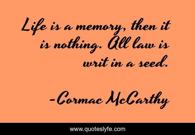 This page presents the quote "Life is a memory, then it is nothing. All law is writ in a seed.". Author of this quote is Cormac McCarthy. This quote is about life, death, law, memory,.