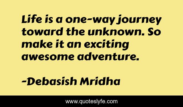 This page presents the quote "Life is a one-way journey toward the unknown. So make it an exciting awesome adventure.". Author of this quote is Debasish Mridha. This quote is about life, philosophy, debasish-mridha, life-is-an-adventure, life-is-a-one-way-journey, quotes, inspirational, enthusiasm, debasish-mridha-m-d,.