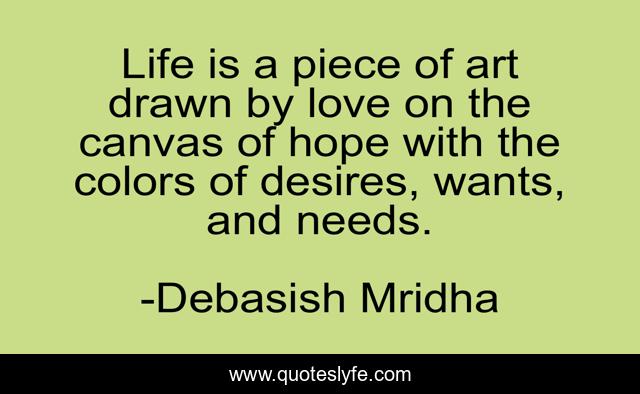 This page presents the quote "Life is a piece of art drawn by love on the canvas of hope with the colors of desires, wants, and needs.". Author of this quote is Debasish Mridha. This quote is about debasish-mridha, philosophy, life-is-a-piece-of-art, canvas-of-hope, quotes, debasish-mridha-md, inspirational, enthusiasm, metaphor-for-art,.