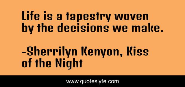 This page presents the quote "Life is a tapestry woven by the decisions we make.". Author of this quote is Sherrilyn Kenyon, Kiss of the Night. This quote is about life, life-experience,.