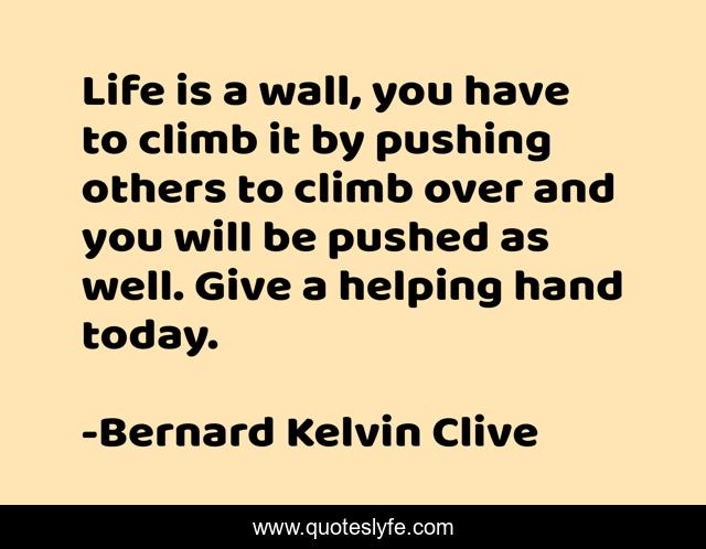This page presents the quote "Life is a wall, you have to climb it by pushing others to climb over and you will be pushed as well. Give a helping hand today.". Author of this quote is Bernard Kelvin Clive. This quote is about support, life-and-living,.