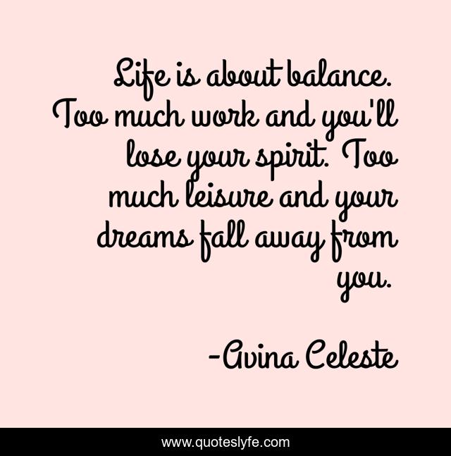 This page presents the quote "Life is about balance. Too much work and you'll lose your spirit. Too much leisure and your dreams fall away from you.". Author of this quote is Avina Celeste. This quote is about life, positive, motivational, confidence, optimistic, inspirational, enthusiasm, balance, dreams,.