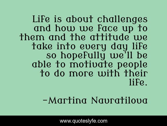 This page presents the quote "Life is about challenges and how we face up to them and the attitude we take into every day life so hopefully we'll be able to motivate people to do more with their life.". Author of this quote is Martina Navratilova. This quote is about challenges, life, day,.