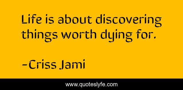 This page presents the quote "Life is about discovering things worth dying for.". Author of this quote is Criss Jami. This quote is about discipline, life, death, love, discovery, experience, maturity, suffering, growth,.