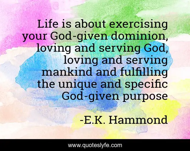 This page presents the quote "Life is about exercising your God-given dominion, loving and serving God, loving and serving mankind and fulfilling the unique and specific God-given purpose". Author of this quote is E.K. Hammond. This quote is about life, purpose, success, successful-living,.
