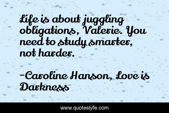 This page presents the quote "Life is about juggling obligations, Valerie. You need to study smarter, not harder.". Author of this quote is Caroline Hanson, Love is Darkness. This quote is about life, val, obligations, smarter, study, obstacles, harder, valerie-dearborn, caroline-hanson,.