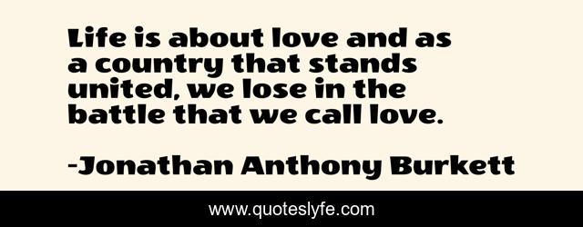 This page presents the quote "Life is about love and as a country that stands united, we lose in the battle that we call love.". Author of this quote is Jonathan Anthony Burkett. This quote is about life, shootings, love, independence, battle, united-states-of-america, affection,.