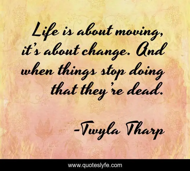 This page presents the quote "Life is about moving, it’s about change. And when things stop doing that they’re dead.". Author of this quote is Twyla Tharp. This quote is about life, death, change,.