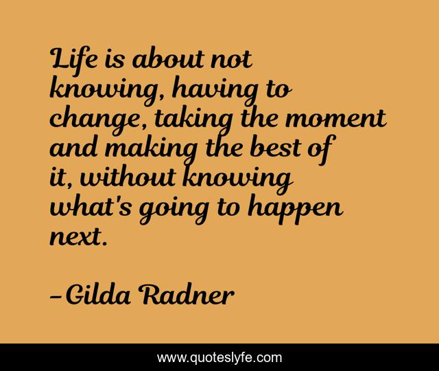 This page presents the quote "Life is about not knowing, having to change, taking the moment and making the best of it, without knowing what's going to happen next.". Author of this quote is Gilda Radner. This quote is about life, moment, change,.