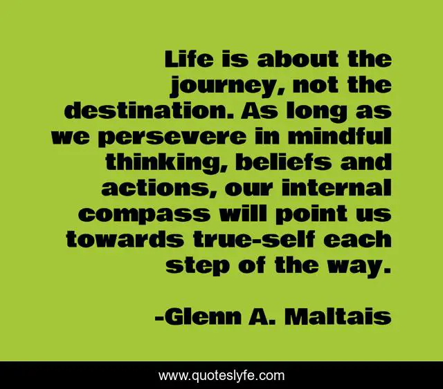 This page presents the quote "Life is about the journey, not the destination. As long as we persevere in mindful thinking, beliefs and actions, our internal compass will point us towards true-self each step of the way.". Author of this quote is Glenn A. Maltais. .