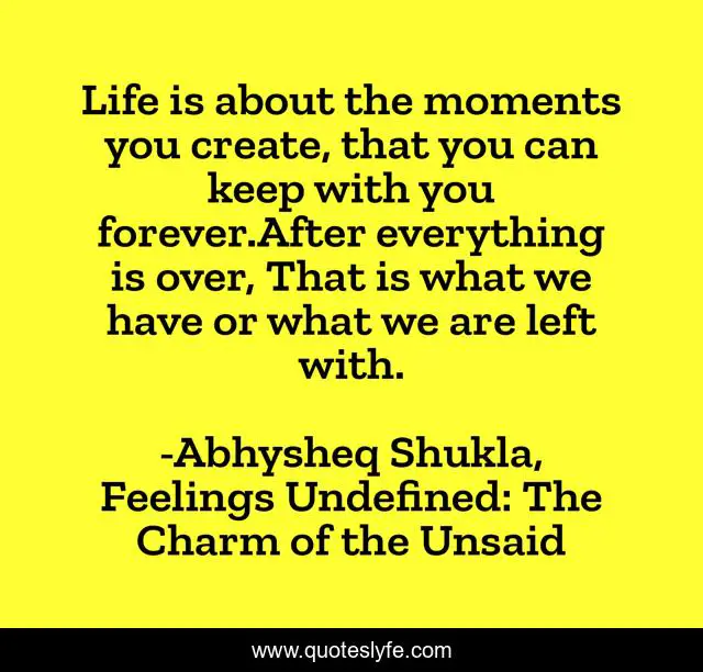 "Abhysheq Shukla, Feelings Undefined: The Charm of the Unsaid Quotes." Quoteslyfe.com, 2025. Fri. 05 Dec. 2025. <https://www.quoteslyfe.com/quote/Life-is-about-the-moments-you-create-34112>.