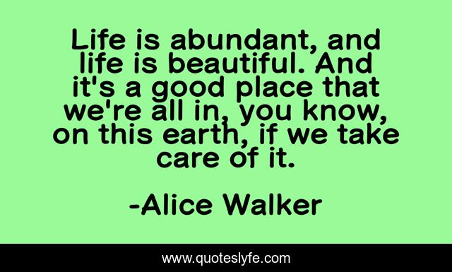 This page presents the quote "Life is abundant, and life is beautiful. And it's a good place that we're all in, you know, on this earth, if we take care of it.". Author of this quote is Alice Walker. This quote is about beautiful, earth, life,.