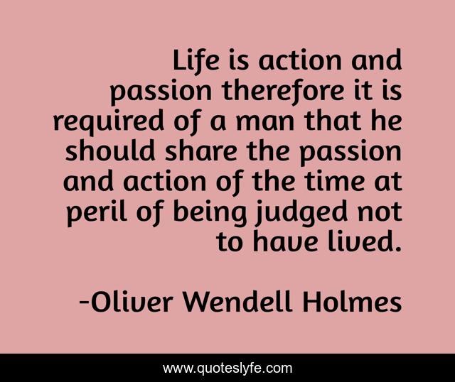 This page presents the quote "Life is action and passion therefore it is required of a man that he should share the passion and action of the time at peril of being judged not to have lived.". Author of this quote is Oliver Wendell Holmes. .