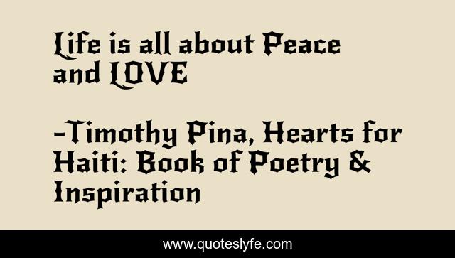 "Timothy Pina, Hearts for Haiti: Book of Poetry & Inspiration Quotes." Quoteslyfe.com, 2025. Sat. 06 Dec. 2025. <https://www.quoteslyfe.com/quote/Life-is-all-about-Peace-and-LOVE-73501>.