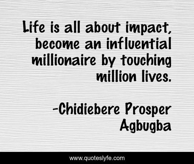 This page presents the quote "Life is all about impact, become an influential millionaire by touching million lives.". Author of this quote is Chidiebere Prosper Agbugba. This quote is about impact, enthusiasm, influence, inspirational,.