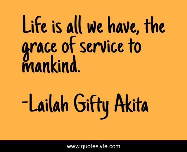 This page presents the quote "Life is all we have, the grace of service to mankind.". Author of this quote is Lailah Gifty Akita. This quote is about life, volunteering, grace-service, mankind, humanity, missionary,.