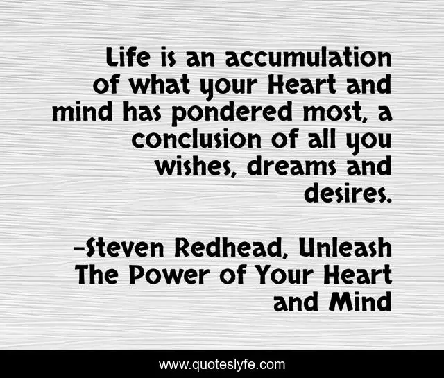 This page presents the quote "Life is an accumulation of what your Heart and mind has pondered most, a conclusion of all you wishes, dreams and desires.". Author of this quote is Steven Redhead, Unleash The Power of Your Heart and Mind. This quote is about heart, life, desires, mind, wishes, accumulation, dreams, conclusion,.