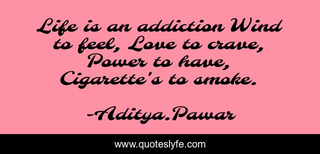 This page presents the quote "Life is an addiction Wind to feel, Love to crave, Power to have, Cigarette's to smoke.". Author of this quote is Aditya.Pawar. This quote is about life, love, girls, craves, cigarette, inspirational, enthusiasm, addiction, truth-of-life,.