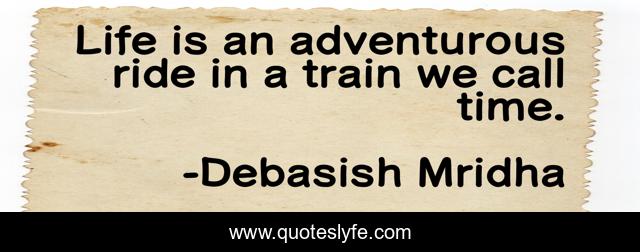 This page presents the quote "Life is an adventurous ride in a train we call time.". Author of this quote is Debasish Mridha. This quote is about life-is-an-adventure, debasish, train-we-call-time, mridha, philosophy, debasish-mridha, inspirational, enthusiasm, life-is-an-adventurous-ride,.