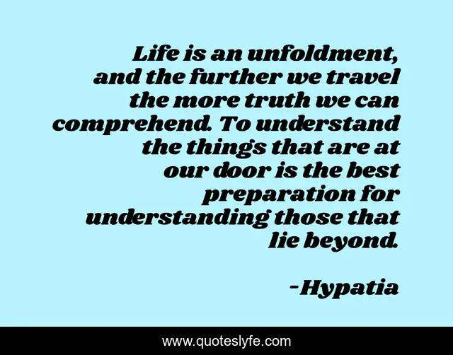 This page presents the quote "Life is an unfoldment, and the further we travel the more truth we can comprehend. To understand the things that are at our door is the best preparation for understanding those that lie beyond.". Author of this quote is Hypatia. This quote is about life, travel, truth,.