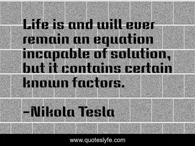 This page presents the quote "Life is and will ever remain an equation incapable of solution, but it contains certain known factors.". Author of this quote is Nikola Tesla. This quote is about life, humor, science, inspirational, enthusiasm, inspiration,.