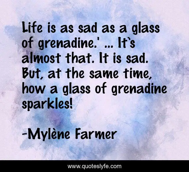 This page presents the quote "Life is as sad as a glass of grenadine.' ... It’s almost that. It is sad. But, at the same time, how a glass of grenadine sparkles!". Author of this quote is Mylène Farmer. This quote is about grenadine, singers, life, musicians, sadness,.