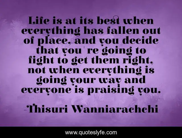 This page presents the quote "Life is at its best when everything has fallen out of place, and you decide that you're going to fight to get them right, not when everything is going your way and everyone is praising you.". Author of this quote is Thisuri Wanniarachchi. This quote is about hard-times, life, adversity, inspirational, enthusiasm, happiness,.