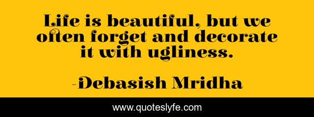 This page presents the quote "Life is beautiful, but we often forget and decorate it with ugliness.". Author of this quote is Debasish Mridha. This quote is about beautiful, life, debasish, forget, mridha, philosophy, debasish-mridha, life-is-beautiful, decorate,.