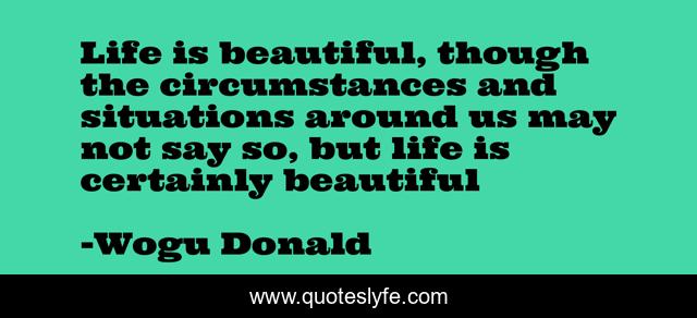 This page presents the quote "Life is beautiful, though the circumstances and situations around us may not say so, but life is certainly beautiful". Author of this quote is Wogu Donald. This quote is about enthusiasm, educational, inspirational, relationship, entrepreneurship,.