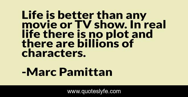 This page presents the quote "Life is better than any movie or TV show. In real life there is no plot and there are billions of characters.". Author of this quote is Marc Pamittan. This quote is about life, characters, characteristics, reality, stars, movie, starstruck,.