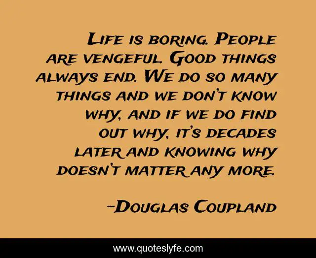 This page presents the quote "Life is boring. People are vengeful. Good things always end. We do so many things and we don’t know why, and if we do find out why, it’s decades later and knowing why doesn’t matter any more.". Author of this quote is Douglas Coupland. This quote is about life, wisdom,.
