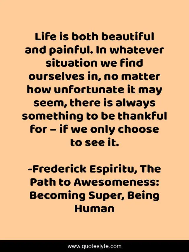 This page presents the quote "Life is both beautiful and painful. In whatever situation we find ourselves in, no matter how unfortunate it may seem, there is always something to be thankful for – if we only choose to see it.". Author of this quote is Frederick Espiritu, The Path to Awesomeness: Becoming Super, Being Human. This quote is about gratitude, life,.