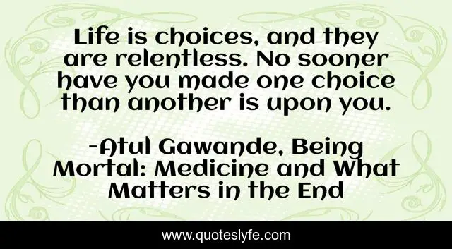 "Atul Gawande, Being Mortal: Medicine and What Matters in the End Quotes." Quoteslyfe.com, 2025. Sat. 06 Dec. 2025. <https://www.quoteslyfe.com/quote/Life-is-choices-and-they-are-relentless-243233>.