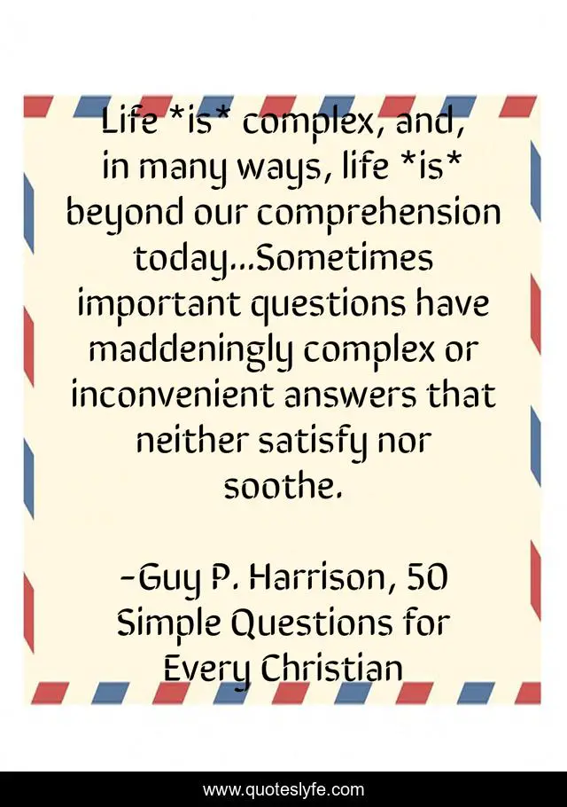 This page presents the quote "Life *is* complex, and, in many ways, life *is* beyond our comprehension today...Sometimes important questions have maddeningly complex or inconvenient answers that neither satisfy nor soothe.". Author of this quote is Guy P. Harrison, 50 Simple Questions for Every Christian. This quote is about god, comprehension, questions,.