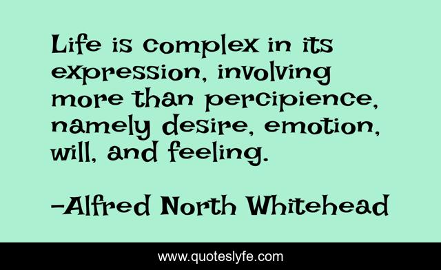 This page presents the quote "Life is complex in its expression, involving more than percipience, namely desire, emotion, will, and feeling.". Author of this quote is Alfred North Whitehead. This quote is about desire, emotion, life, complex, feeling, expression,.