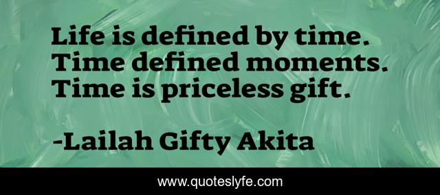 This page presents the quote "Life is defined by time. Time defined moments. Time is priceless gift.". Author of this quote is Lailah Gifty Akita. This quote is about time-management, moment-of-being, priceless-dialogue, gift, moments, time-travel, gift-of-life, moments-in-which-you-love-life, moment,.
