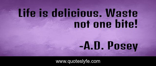 This page presents the quote "Life is delicious. Waste not one bite!". Author of this quote is A.D. Posey. This quote is about spiritual-growth, life, wisdom-inspirational, peace, life-and-sayings, delicious, awareness, truth, smile,.