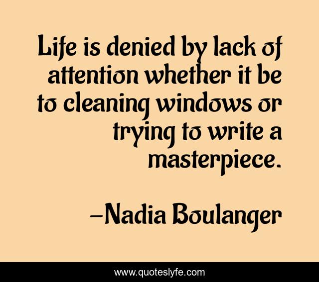 This page presents the quote "Life is denied by lack of attention whether it be to cleaning windows or trying to write a masterpiece.". Author of this quote is Nadia Boulanger. .