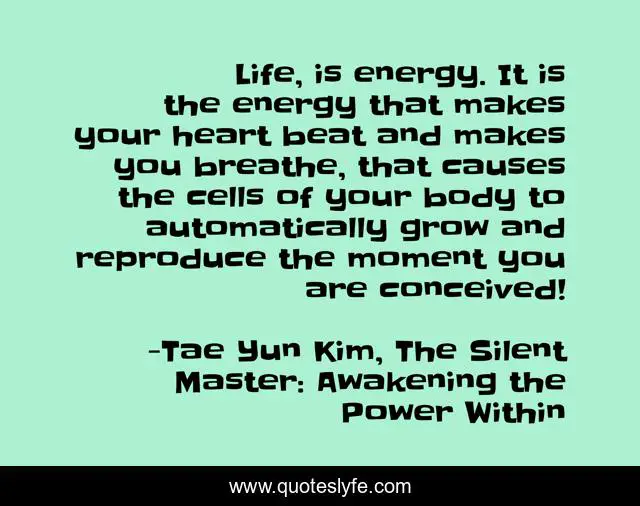 This page presents the quote "Life, is energy. It is the energy that makes your heart beat and makes you breathe, that causes the cells of your body to automatically grow and reproduce the moment you are conceived!". Author of this quote is Tae Yun Kim, The Silent Master: Awakening the Power Within. This quote is about inspirational, energy, famous, life-lessons, heartbeat, enthusiasm,.