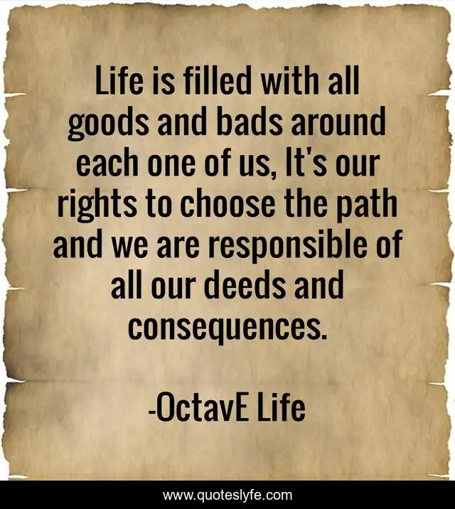 This page presents the quote "Life is filled with all goods and bads around each one of us, It's our rights to choose the path and we are responsible of all our deeds and consequences.". Author of this quote is OctavE Life. This quote is about life-philosophy, life-experience,.