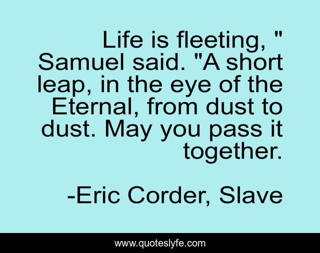 This page presents the quote "Life is fleeting, " Samuel said. "A short leap, in the eye of the Eternal, from dust to dust. May you pass it together.". Author of this quote is Eric Corder, Slave. This quote is about love, life, marriage, affection,.
