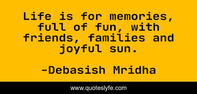 This page presents the quote "Life is for memories, full of fun, with friends, families and joyful sun.". Author of this quote is Debasish Mridha. This quote is about life, families, joy, memories, sun, fun, friends, joyful, friend,.