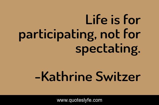 This page presents the quote "Life is for participating, not for spectating.". Author of this quote is Kathrine Switzer. This quote is about enthusiasm, running, spectate, inspirational, participate,.