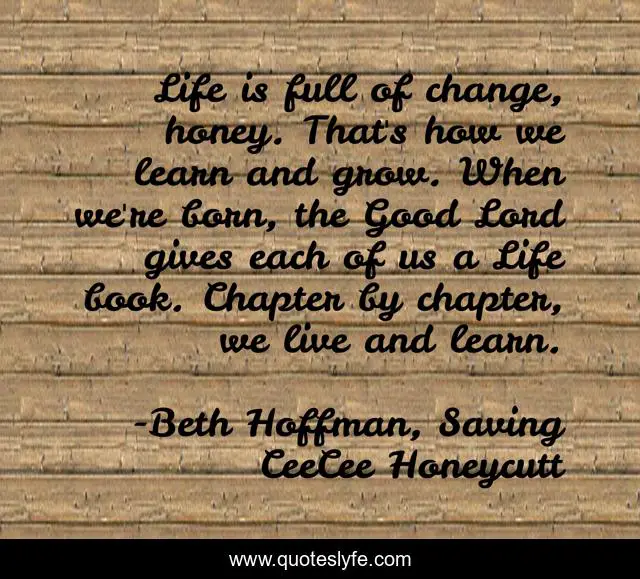 This page presents the quote "Life is full of change, honey. That's how we learn and grow. When we're born, the Good Lord gives each of us a Life book. Chapter by chapter, we live and learn.". Author of this quote is Beth Hoffman, Saving CeeCee Honeycutt. This quote is about faith, inspirational, enthusiasm,.
