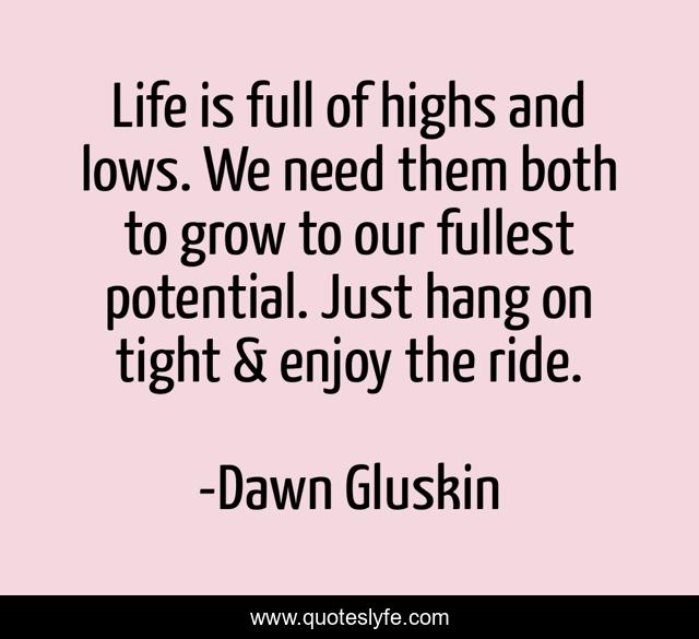 This page presents the quote "Life is full of highs and lows. We need them both to grow to our fullest potential. Just hang on tight & enjoy the ride.". Author of this quote is Dawn Gluskin. This quote is about enjoy, life, love, highs, zen, journey, lows, potential, affection,.